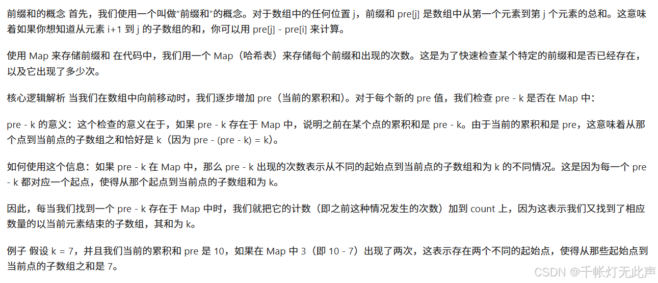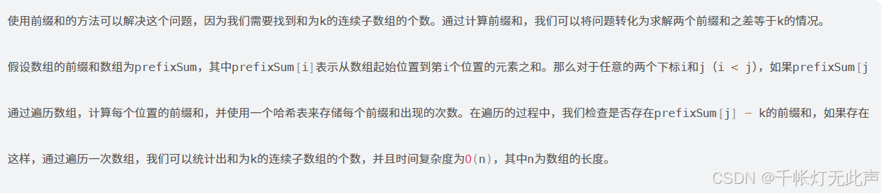 pre[i] 表示前 i 项和,所以 pre[i] - pre[j - 1] == k 表示 [j, i] 的区间和 满足题目要求
