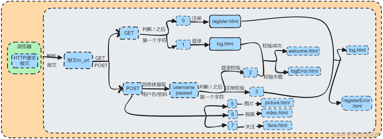 服务器解析浏览器的请求报文,当解析为POST请求时,cgi 标志位设置为1,并将请求报文的消息体赋值给 m_string,进而提取出用户名和密码