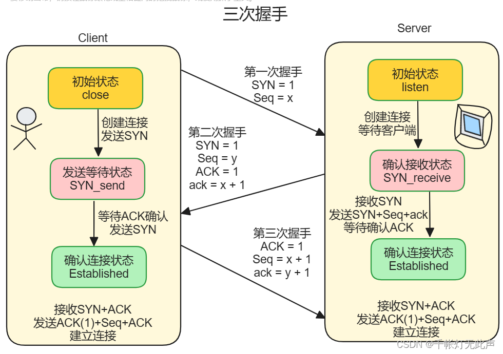 (但是站在服务端思考:你的发送和我的接受都 ok,但是你还没给我回复,我不知道我的发送和你的接收 ok 不 ok?所以,你要给我第三次握手,传个话告诉我。如果你不告诉我,我认为你跑了,出于安全性考虑,我会继续给你发一次)- 第三次握手:客户端收到服务器的 SYN + ACK 后,直到可以接着发送下一序列的数据包了,然后发送确认序列号 ack = y + 1 和数据包的序列号 seq = x + 1,确认号 ACK = 1 确认包作为应答,客户端转为 Established 状态(站在双方的角度思考,都 ok)