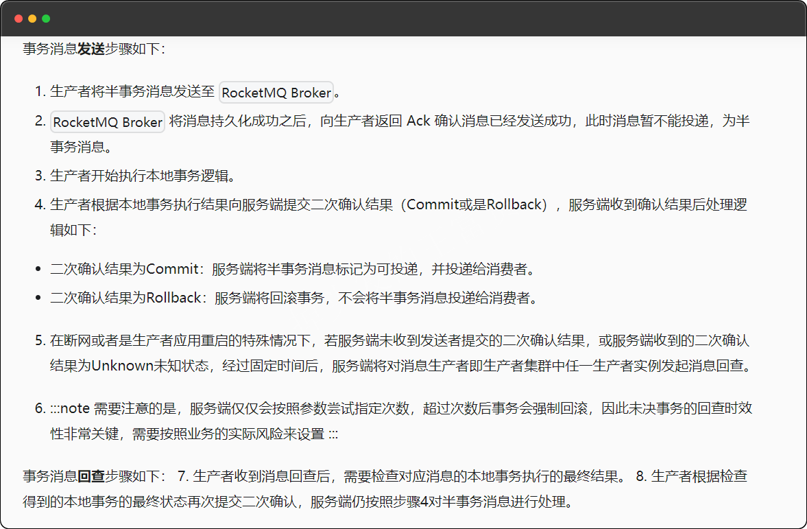 - 二次确认结果为Rollback:服务端将回滚事务,不会将半事务消息投递给消费者。