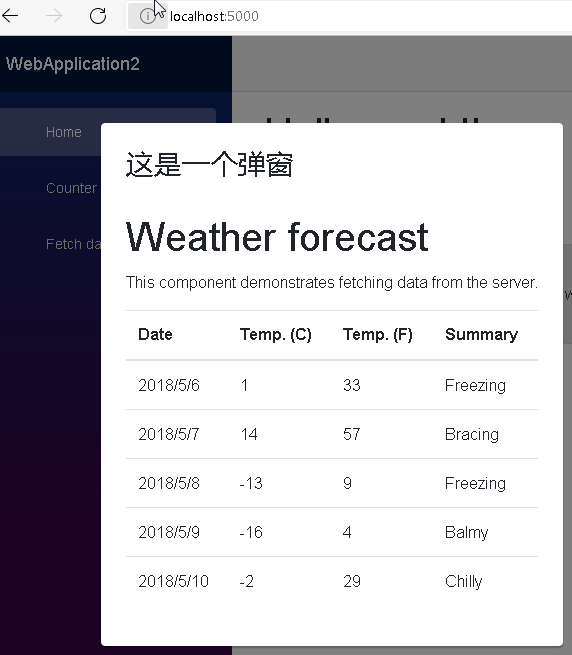 Blazored.Modal 组件可以将一个普通的 razor 组件以 Modal 的形态展现出来, 比如 FetchData 这个 razor 组件, 下面简单的代码就会将 FetchData 以弹窗形式显示.