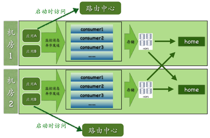 cat 所有服务器组件, 包括 cat-consumer 和 cat-home , 都是运行在同一个 JVM 内部的, 所以每个 cat 服务端既可以作为 consumer, 也可以作为 home, 另外一个 cat 集群可以跨多个数据中心.