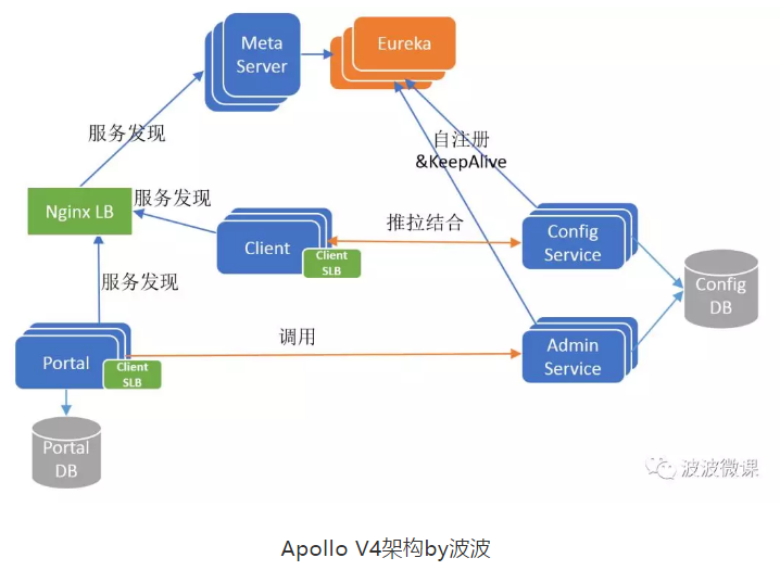 ConfgService/AdminService/Client/Portal是Apollo的四个核心微服务模块,相互协作完成配置中心业务功能,Eureka/MetaServer/NginxLB是辅助微服务之间进行服务发现的模块。