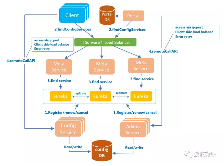 现在还有一个问题,MetaServer本身也是无状态以集群方式部署的,那么Client/Protal该如何发现MetaServer呢?一种传统的做法是借助硬件或者软件负载均衡器,例如在携程采用的是扩展后的NginxLB(也称Software Load Balancer),由运维为MetaServer集群配置一个域名,指向NginxLB集群,NginxLB再对MetaServer进行负载均衡和流量转发。Client/Portal通过域名+NginxLB间接访问MetaServer集群。
