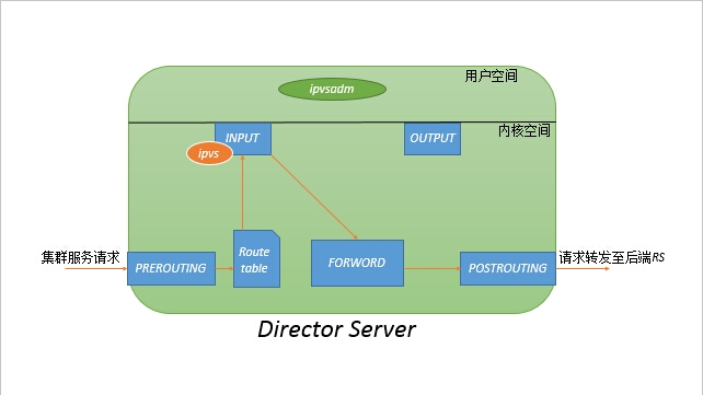 上图所示,ipvs工作于内核空间的INPUT链上,当收到用户请求某集群服务时,经过PREROUTING链,经检查本机路由表,送往INPUT链;在进入netfilter的INPUT链时,ipvs强行将请求报文通过ipvsadm定义的集群服务策略的路径改为FORWORD链,将报文转发至后端真实提供服务的主机。