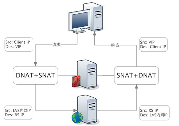 LVS 收到包后,在 NAT 模式修改源地址的基础上,再把 RS 发来的包中的目标地址从 LVS 内网 IP 改为客户端的 IP。