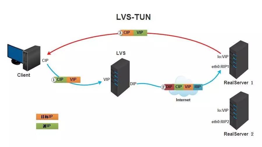 2.TUNNEL 模式的 vip ------>realserver 的包通信通过 TUNNEL 模式,不管是内网和外网都能通信,所以不需要 lvs vip 跟 realserver 在同一个网段内