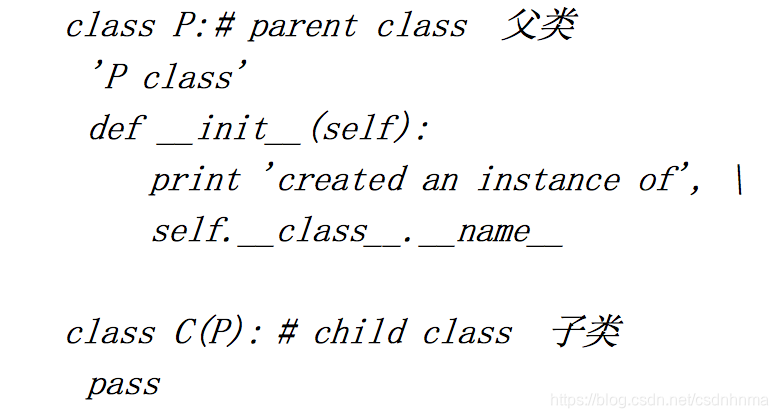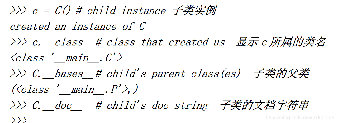 C 没有声明__init__()方法,然而在类 C 的实例 c 被创建时,还是会有输出信息。原因在于 C 继 承了 P 的__init__()。__bases__元组列出了其父类 P。需要⚠️的是文档字符串对类,函数/方法, 还有模块来说都是唯一的,所以特殊属性__doc__不会从基类中继承过来。