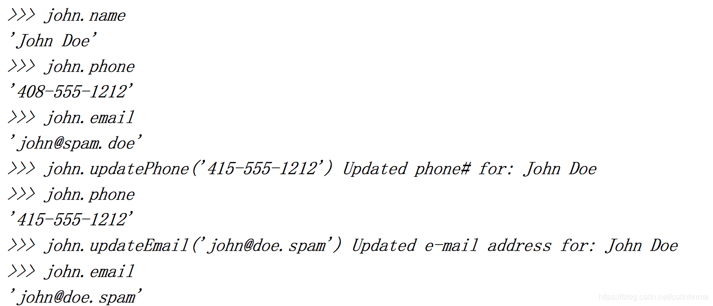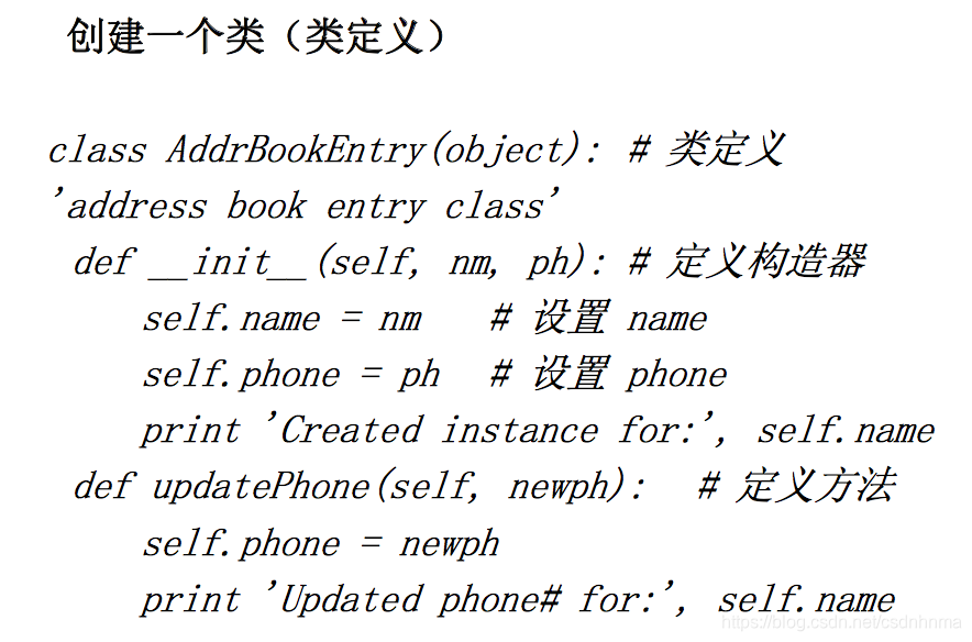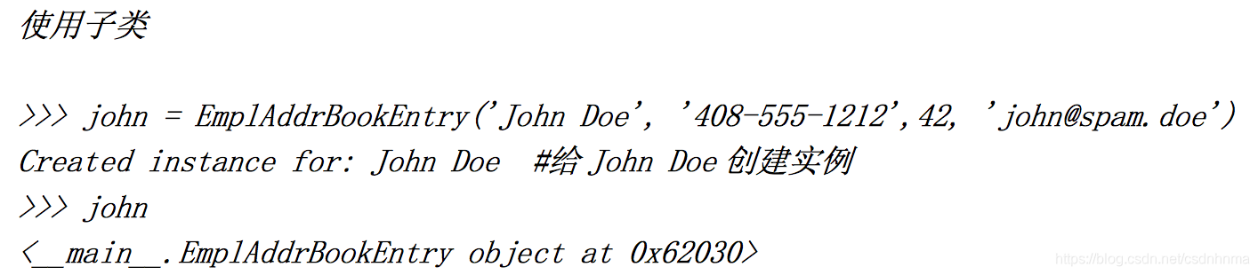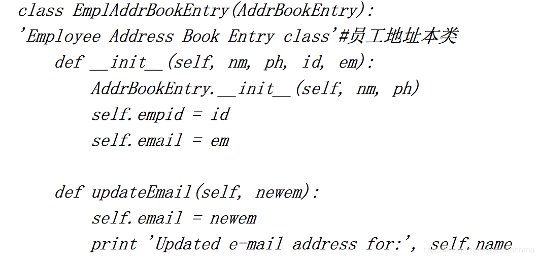 EmplAddrBookEntry。Python 中,当一个类被派生出来,子类继 承了基类的属性,所以,在上面的类中,我们不仅定义了__init__(),updatEmail()方法,而且 EmplAddrBookEntry 还从 AddrBookEntry 中继承了 updatePhone()方法。
