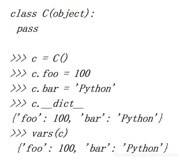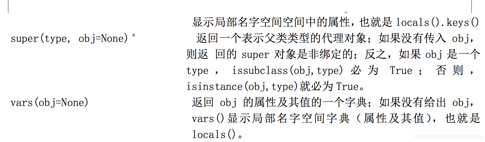 vars()内建函数与 dir()相似,只是给定的对象参数都必须有一个__dict__属性。vars()返回一 个字典,它包含了对象存储于其__dict__中的属性(键)及值。
