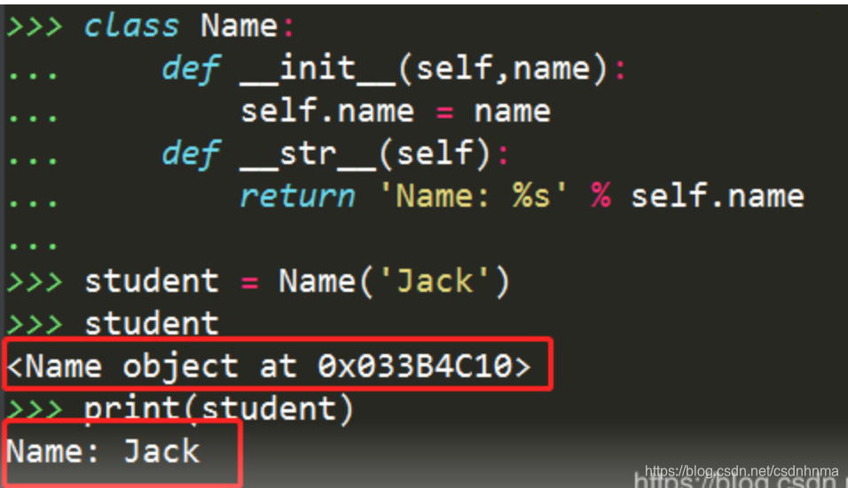 重构__repr__和__str__区别: 把一个类的实例变成 str__repr__和__str__这两个方法都是用于显示的,__str__是面向用户的,而__repr__面向开发者.想要直接输出对象(面向开发者)和使用 print 输入对象都显示的是友好提示除了重构__repr__,还要重构__str__.