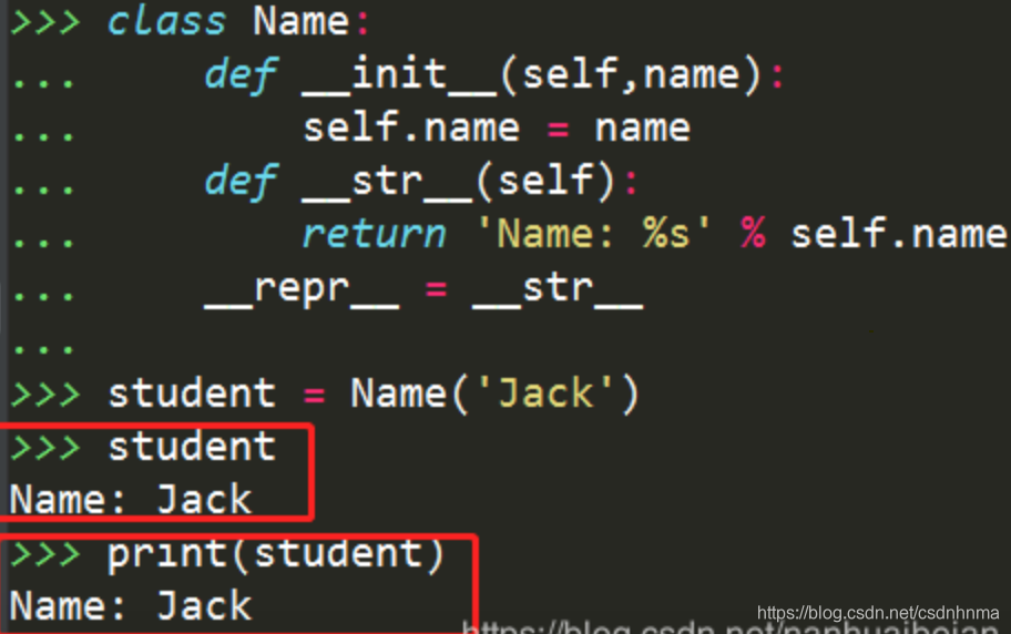 为了可以让__repr__()和__str__()的输出一致,让__repr__()作为__str__()的一个别名: __repr__ = __str__