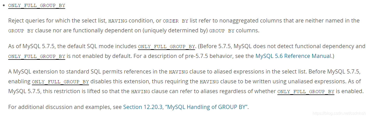 看了下官网:https://dev.mysql.com/doc/refman/5.7/en/sql-mode.html#sqlmode_only_full_group_by,看到5.7.5之后默认only_full_group_by就默认生效。