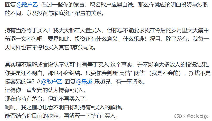 持有当然等于买入!我天天都在大量买入,但你总不能要求我在今后的岁月里天天囊中羞涩一文不名吧。要是如此,投资还有什么意义,什么乐趣!况且,除了茅台,我每一天同样也在不停地买入其它3家公司呢。