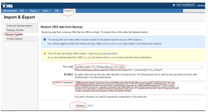 把Step#4备份的文件copy到/usr/lib/jvm/jdk1.6.0_35/import目录下,然后登录进入4.4.5的jira面板,找到“System”-> “Restore System”,录入恢复文件路径以及3.5小节中的License,点击“Restore”按钮开始恢复。