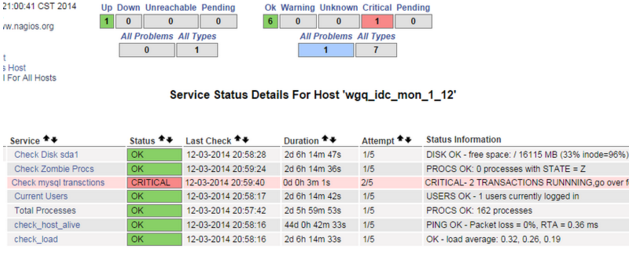 业务报警订单提交异常,页面一直没有反应,排查后是事务没有提交或者回滚导致,想到如果及时监控事务的运行状态报警出来,那么就可以及时排查出问题所在,方便运营处理,所以自己就弄了一个shell脚本放在nagios来处理事务报警情况。