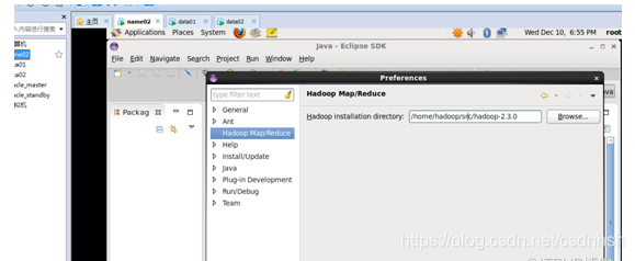 如果插件安装成功,打开Windows—Preferences后,在窗口左侧会有Hadoop Map/Reduce选项,点击此选项,在窗口右侧设置Hadoop安装路径。