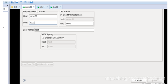 输入Location Name,任意名称即可.配置Map/Reduce Master和DFS Mastrer,Host和Port配置成与core-site.xml的设置一致即可。