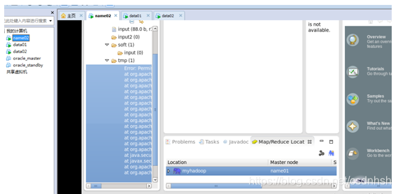 点击"Finish"按钮,关闭窗口。点击左侧的DFSLocations—>myhadoop(上一步配置的location name),如能看到user,表示安装成功,但是进去看到报错信息:Error: Permission denied: user=root,access=READ_EXECUTE,inode="/tmp";hadoop:supergroup:drwx---------,如下图所示: