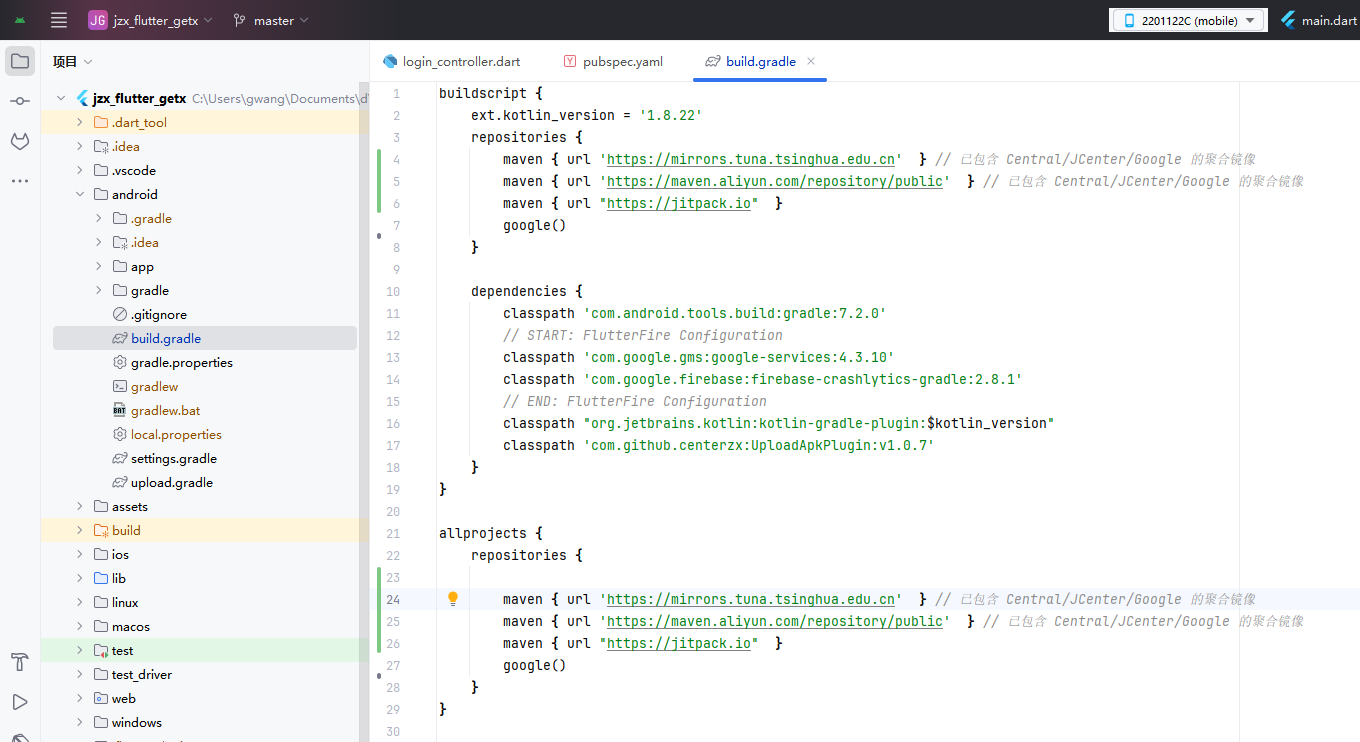 解决办法 用as 单独打开 android 目录 构建app 选择合适的镜像地址