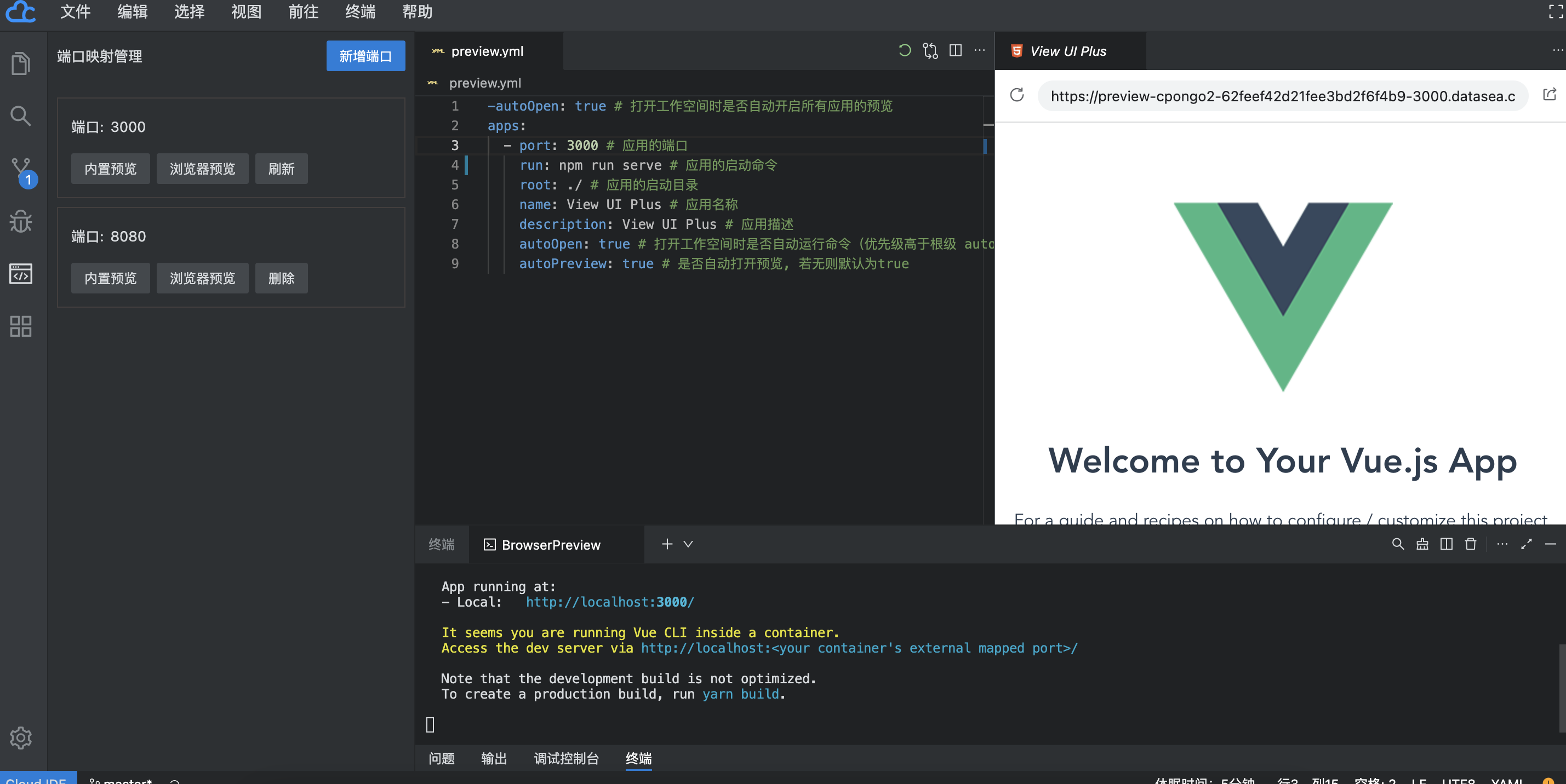 端口映射会自动读取 preview.yml 里的端口,其它通过终端自己启动的端口,需要自己添加。
