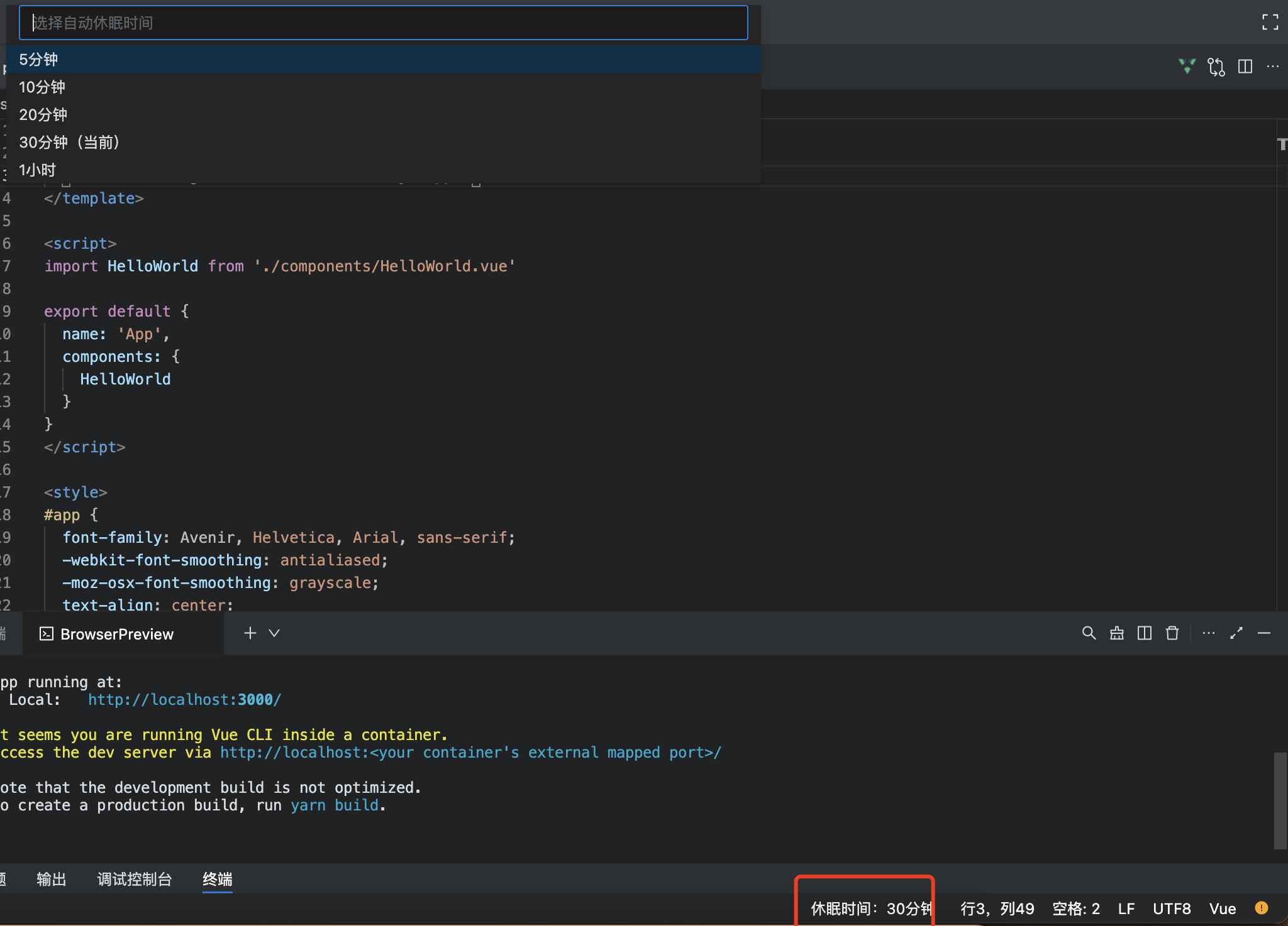 默认的自动休眠时间是 5分钟,也就是离开 IDE 界面5分钟后,会自动结束IDE容器,避免浪费资源。现已支持选择多个自动休眠时间: