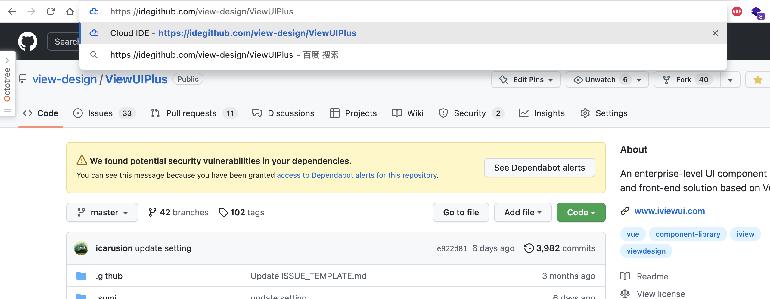 打开任意一个开源项目主页:支持 github.com、gitcode.net、gitee.com,在其地址栏域名前加 ide 前缀,回车,就会快速创建一个该开源项目的工作空间,可用于快速阅读开源项目代码,或者启动、调试: