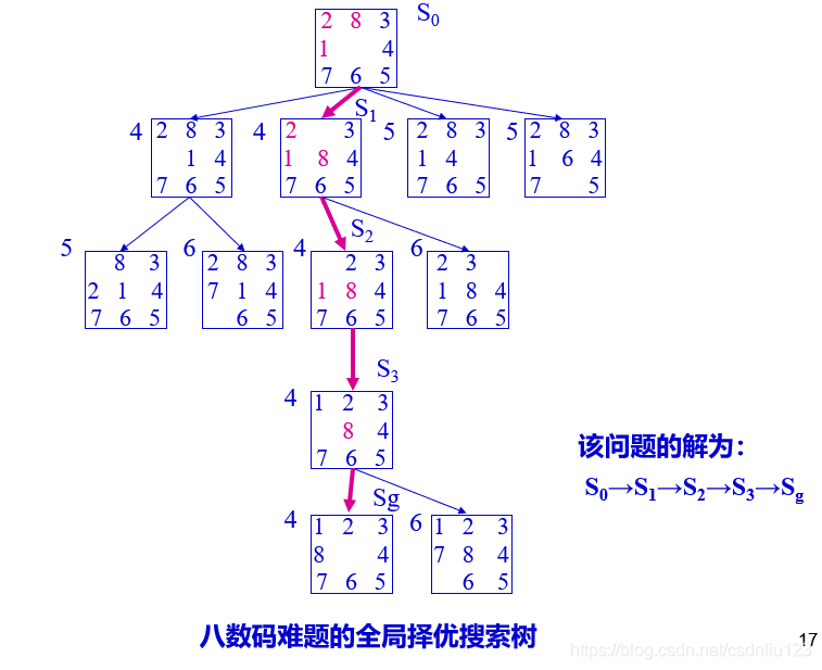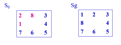 例 八数码难题。设问题的初始状态S0和目标状态Sg如图所示。请用全局择优搜索解决该问题。