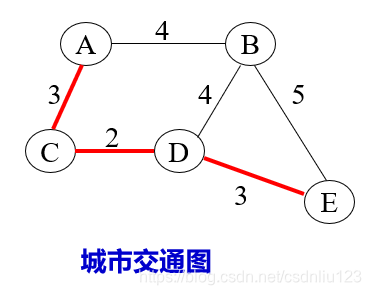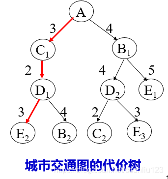 例 城市交通问题。设有5个城市,它们之间的交通线路如左图所示,图中的数字表示两个城市之间的交通费用,即代价。用代价树的广度优先搜索,求从A市出发到E市,费用最小的交通路线。