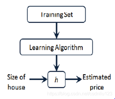 例如,我们要解决房价预测问题,我们实际上是要将训练集“喂”给我们的学习算法,进而学习得一个假设h,然后将我们要预测的房屋的尺寸作为输入变量输入给h,预测出该房屋的交易价格作为输出变量输出的结果,θ是影响h的参数。