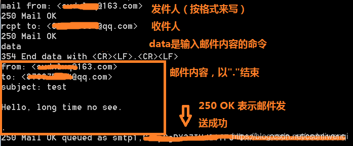 2. 写明发送人(mail from),收件人(rcpt to),信的内容(data)