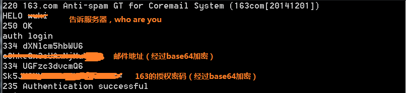 //2. 授权登录服务器,要先后输入你的邮件地址和163邮箱的授权密码。(并且这两个信息要经过base64加密,你可以自己搜索base64就出来了)。