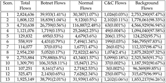 CTU-13是2011年位于捷克共和国的捷克理工大学(CTU)捕获的僵尸网络流量数据集。数据集的目标是对混杂正常流量和背景流量的真实的僵尸网络流量进行大规模捕获。CTU-13数据集包含13个不同的僵尸网络样本捕获(也叫场景)。在每个场景我们执行一个特定的恶意软件,它使用了某些协议并且执行了不同的操作。表2展示了僵尸网络场景的特征。