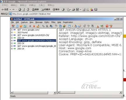这是使用HTTPLook这个HTTP Sniffer软件来俘获的HTTP通讯纪录的一部分:
