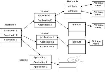 从截屏画面上可以看到Weblogic Server对所有的应用程序设置的cookie的路径都是/,这是不是意味着在Weblogic Server中默认的就可以共享session了呢?然而一个小实验即可证明即使不同的应用程序使用的是同一个session,各个应用程序仍然只能访问自己所设置的那些属性。这说明Weblogic Server中的session的内存结构可能如下: