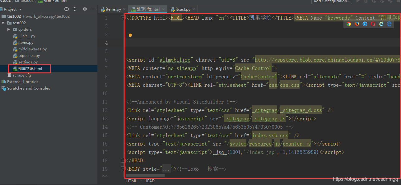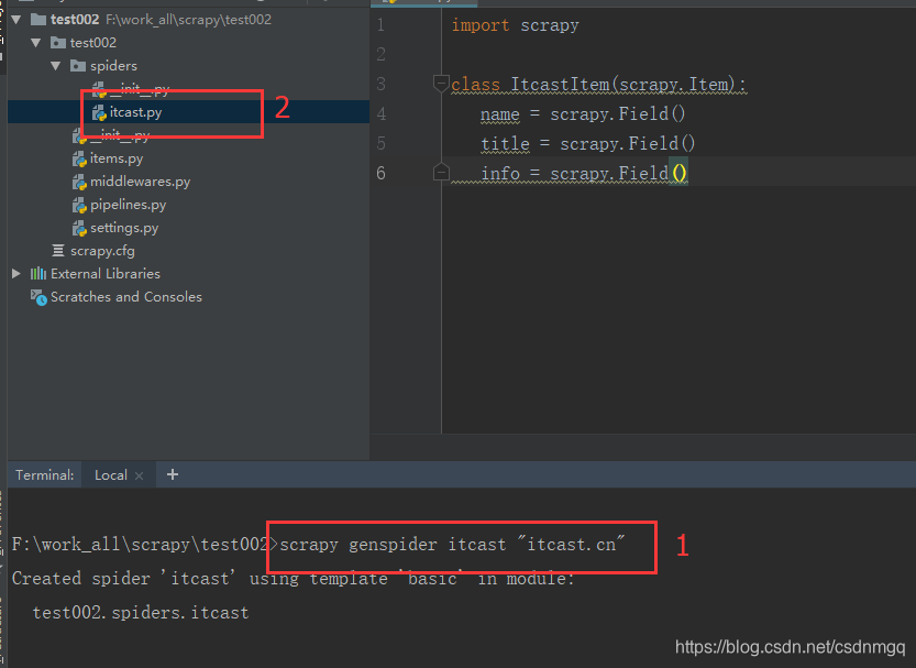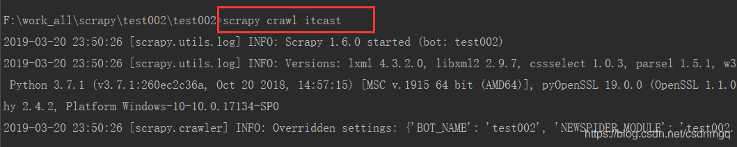 在当前目录下输入命令,将在test002/spiders目录下创建一个名为itcast的爬虫。