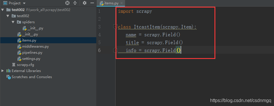 3、制作爬虫 (spiders/xxspider.py):制作爬虫开始爬取网页