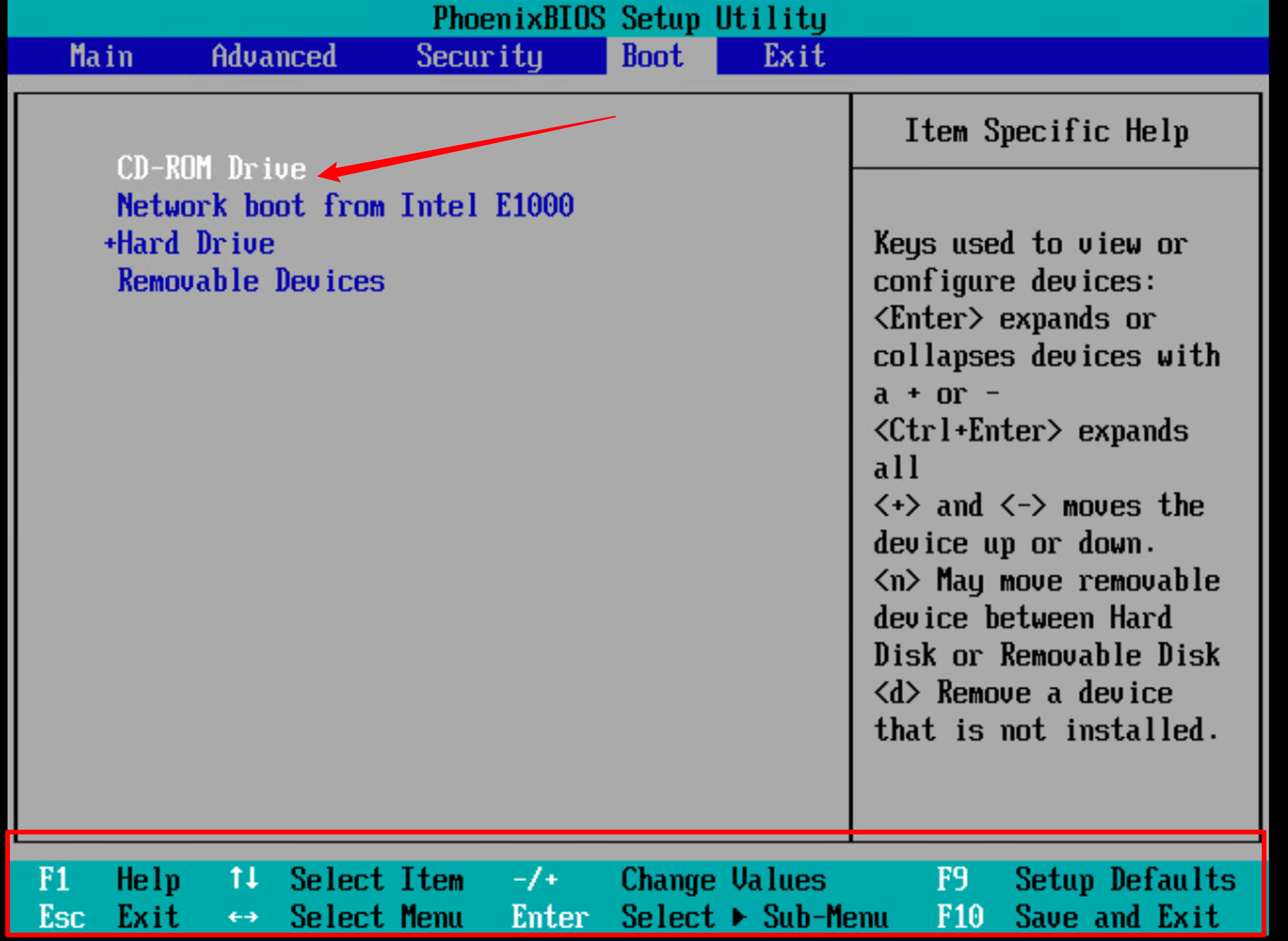 启动之后,在bios界面,使用+-符号来移动顺序,mac上只能用-来移动,将cd作为第一个,然后f10保存即可。