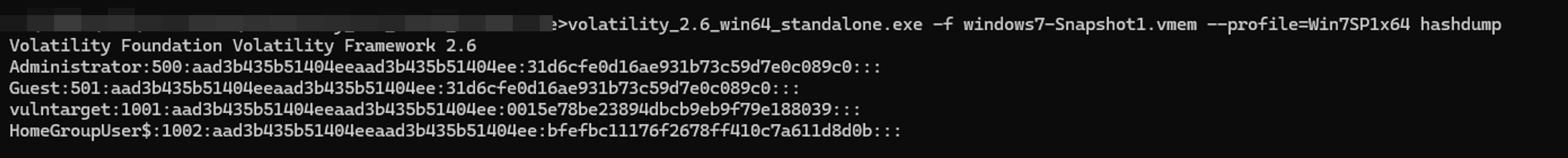 volatility_2.6_win64_standalone.exe -f windows7-Snapshot1.vmem --profile=Win7SP1x64 hashdump