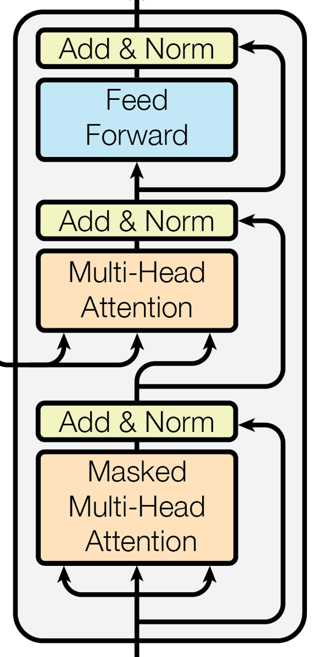 Decoder 中每个子块如图所示,包括 1 个 Masked MHA 子层,1 个 MHA 子层和 1 个 FFN 子层,每个子层又跟着一个残差连接和一个 LN。