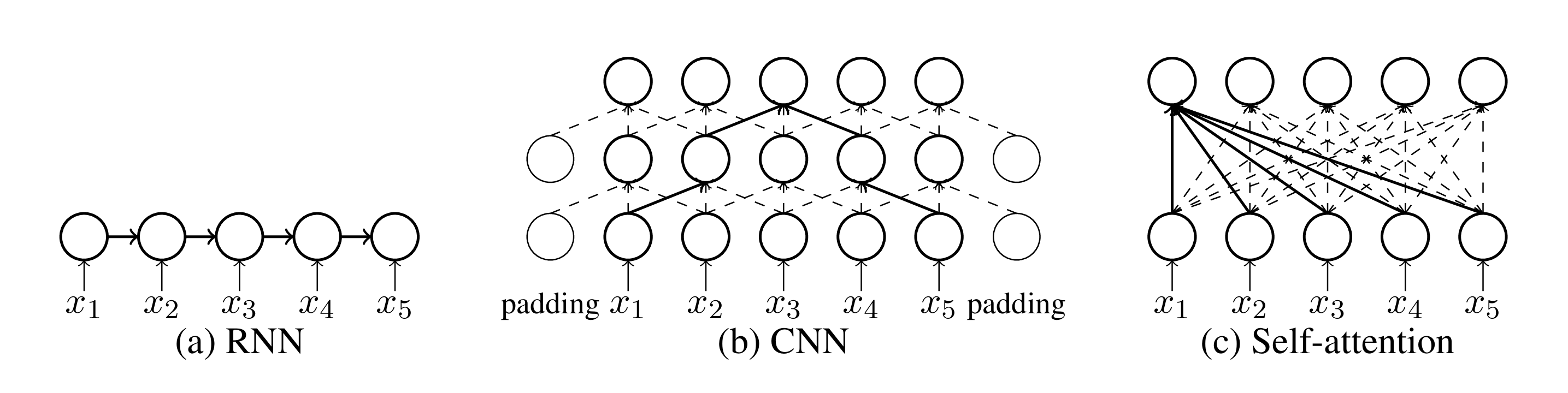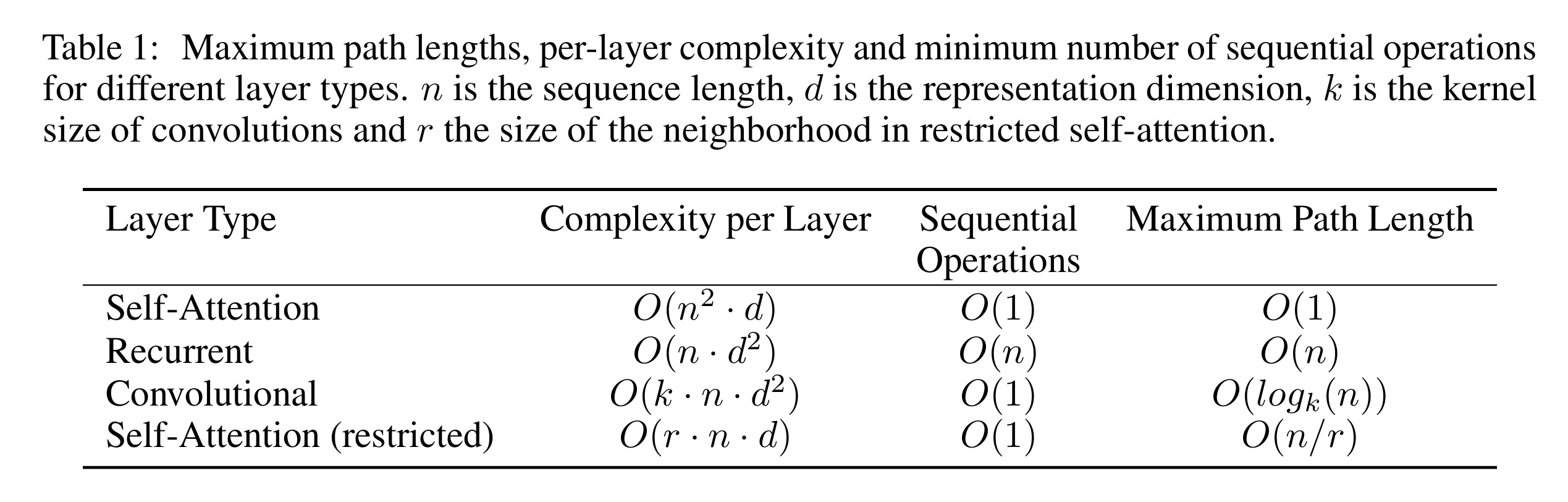 - 最大路径长度:学习长距离依赖的关键因素,越短越好