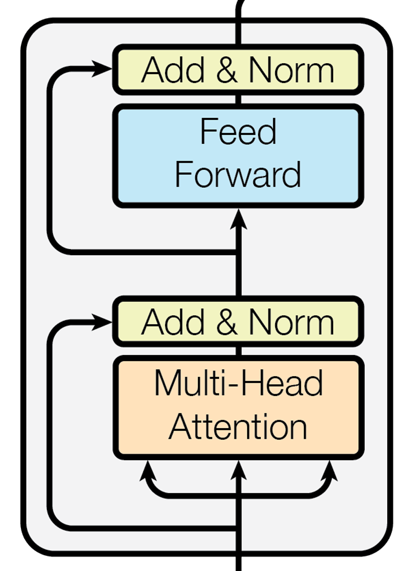 Encoder 中每个子块如图所示,包括 1 个 MHA 子层和 1 个 FFN 子层,每个子层又跟着一个残差连接和一个 Layer Normalization (LN)。