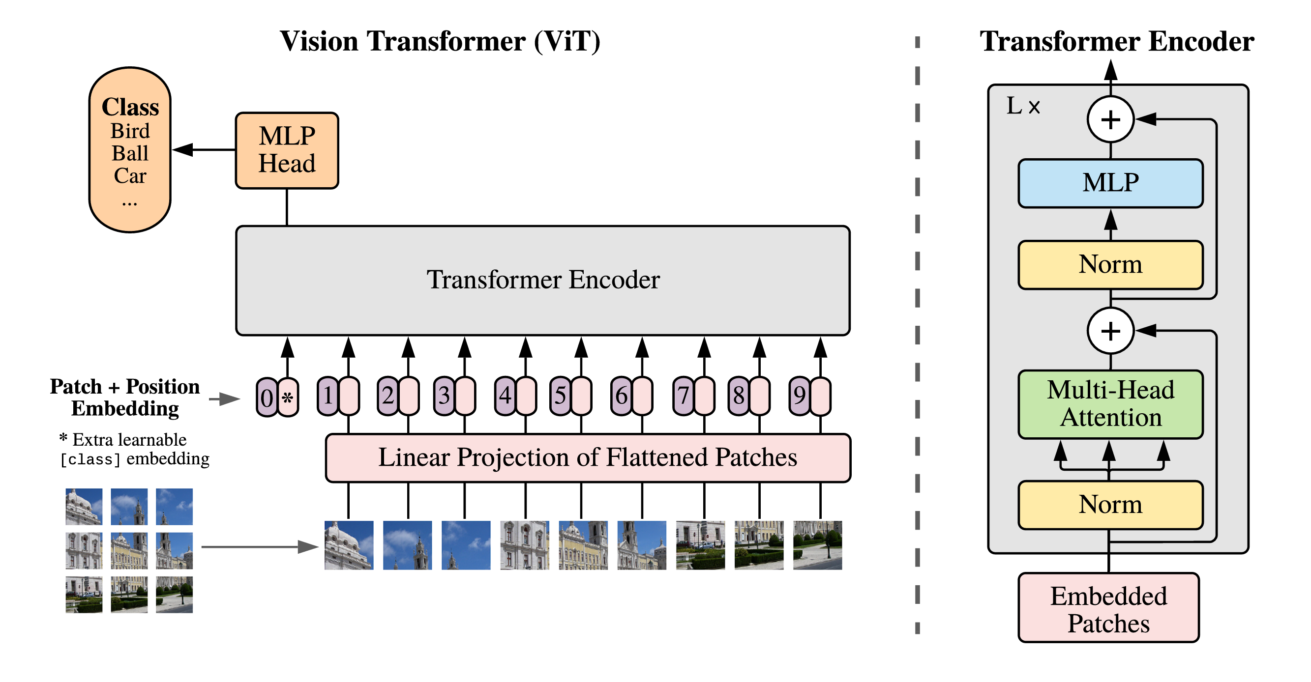 核心思想:将图像切成一个个小块(patch),经过线性投影转换为 token 序列,每个 token 拼接一个位置编码表示 patch 之间的位置关系,[class] token 标识图像类别,然后将这个序列送入 Transformer 的 Encoder,MLP 中的分类头负责预测类别信息。