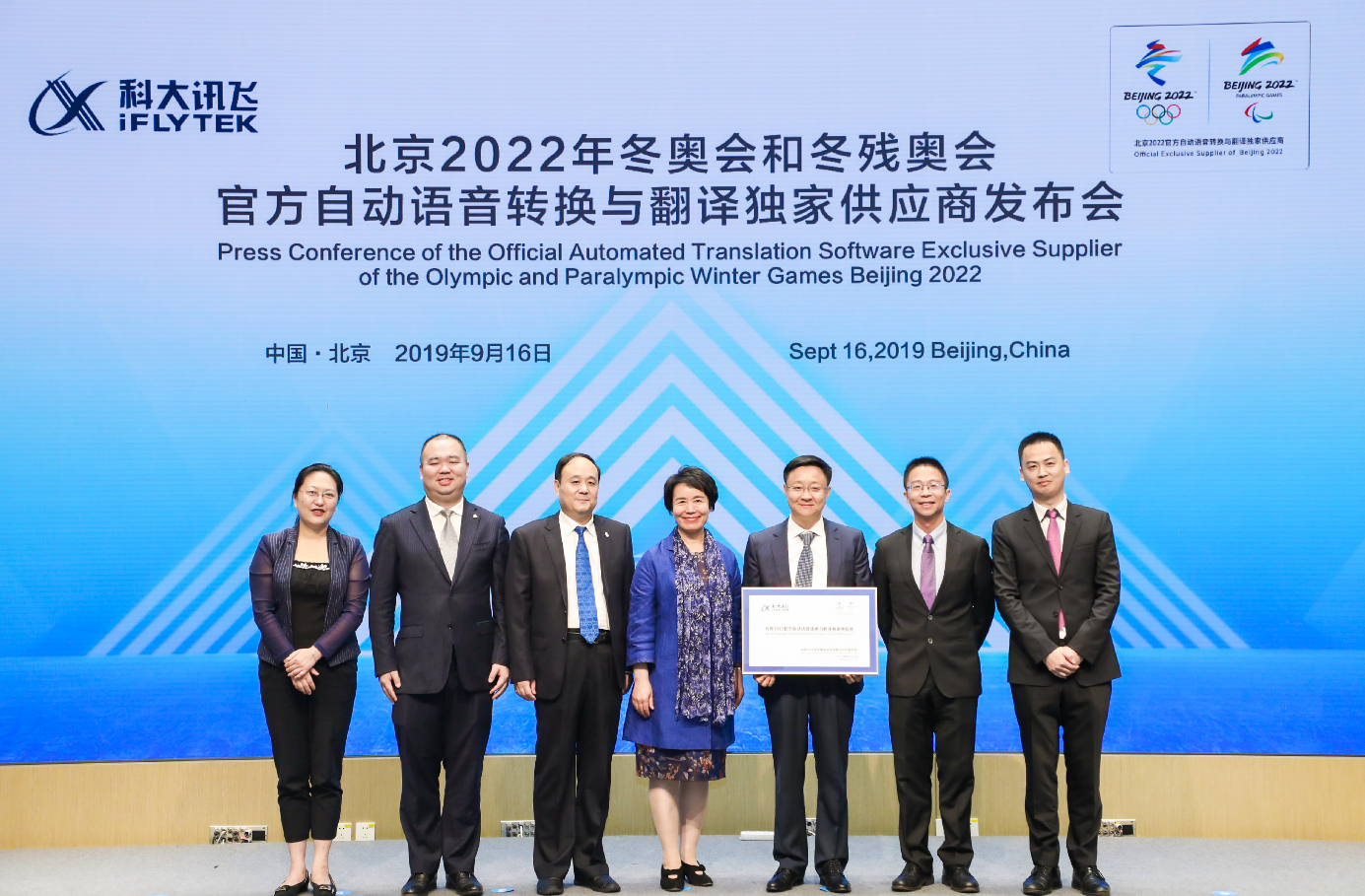 2019 年 9 月 16 日,北京 2022 年冬奥会和冬残奥会官方自动语音转换与翻译独家供应商发布会在北京冬奥组委园区举行。科大讯飞股份有限公司正式成为北京 2022 年冬奥会和冬残奥会官方自动语音转换与翻译独家供应商。