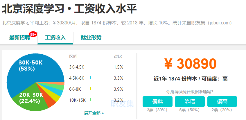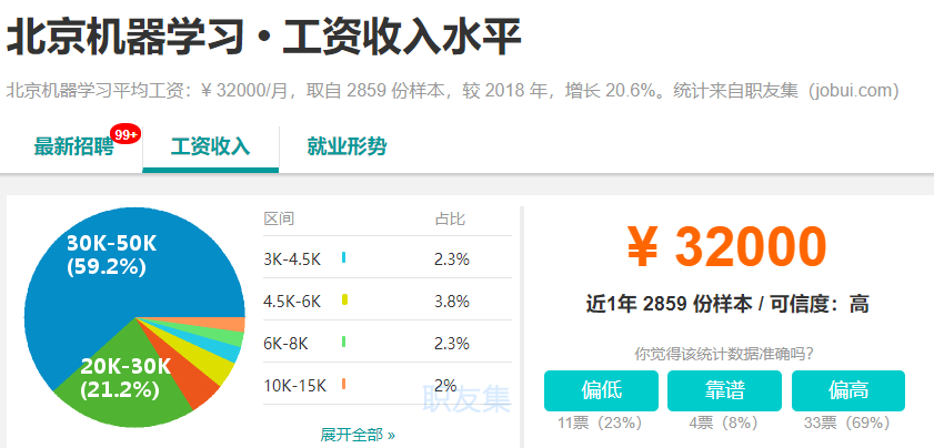 这一迹象,对于广大程序员来说,特别是对即将走向技术一线的准程序员而言,还是值得重点关注的。回顾一下移动互联网所带来的机遇,很容易就能算清,掌握AI能为一线工作带来怎样的优势。比如以下薪酬数据,就让笔者大吃一惊,数据来自于职友集网站2019年11月22号数据: