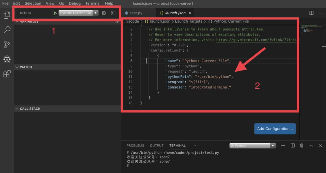 然后在这个 docker 容器中安装 python3,打开 vscode debug 按钮下的命令行,输入如下命令: