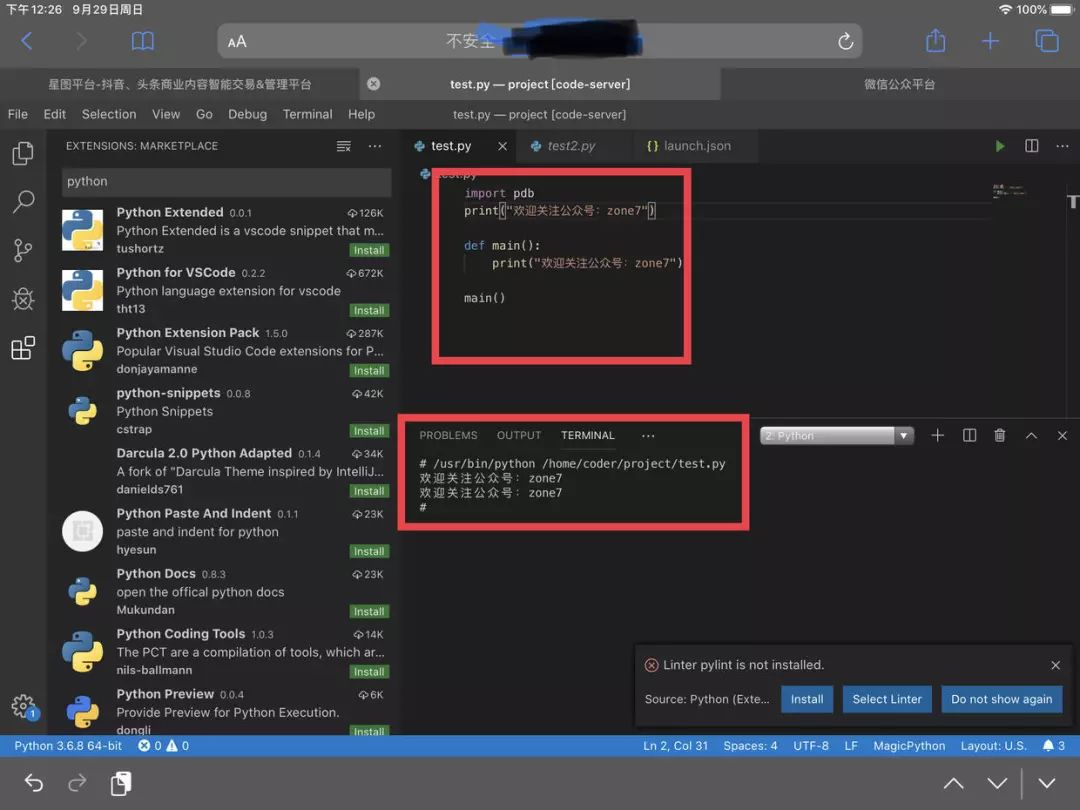配置完成之后,再在扩展库中找一些自己常用的工具库,那么就可以愉快的在浏览器中编辑 python 了。当然其他语言的也是差不多的操作。