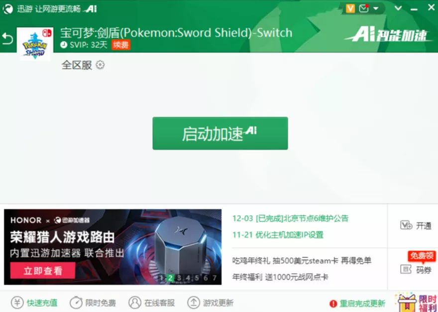在功能方面,该产品内置迅游加速器,支持一键智能加速游戏、AI智能识别、动态智能调整加速线路、无惧跨区跨服跨国。