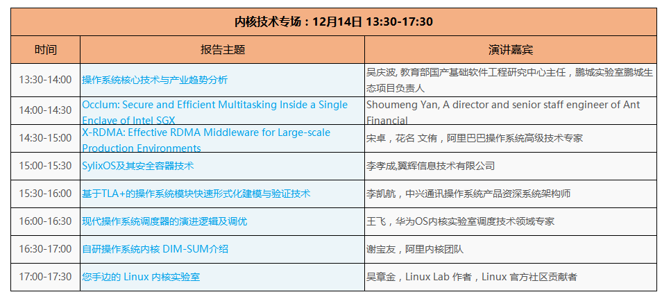 会议当天上午,将由操作系统及相关领域的知名专家学者做大会的年度技术演讲;下午将围绕“内核技术”、“全栈及应用生态”、“编程语言及编译器”、“架构及芯片技术”、“虚拟化技术”等专题举行深入研讨会。大会精彩日程现已出炉,你准备好开启烧脑模式了吗?