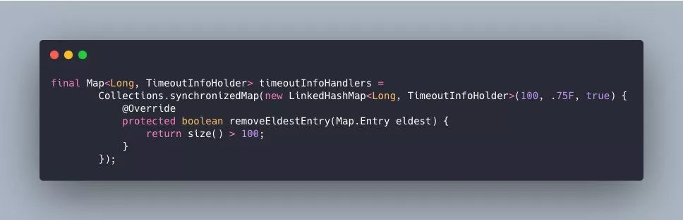 当容量超过100时,开始执行LRU策略:将最近最少未使用的 TimeoutInfoHolder 对象 evict 掉。